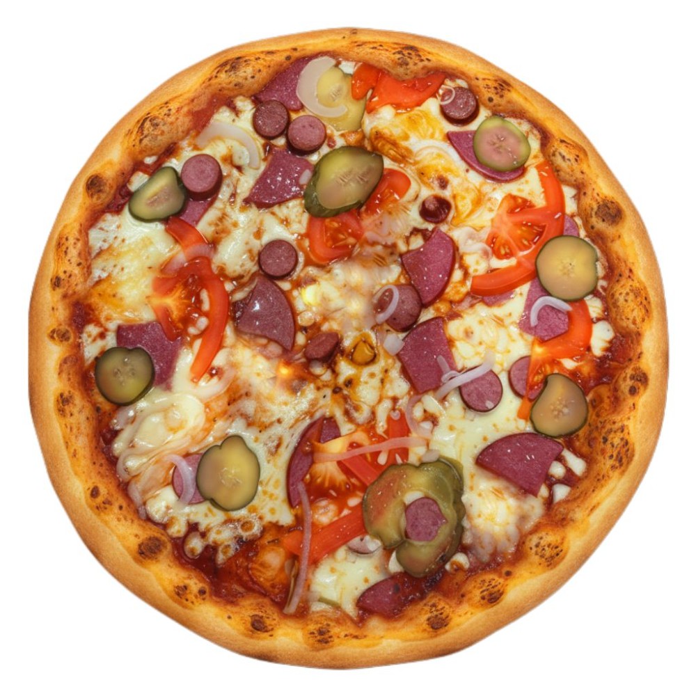 соус Томадоро, сир Моцарела, помідори свіжі, салямі, ковбаски Баварські, огірок солоний, цибуля маринована,